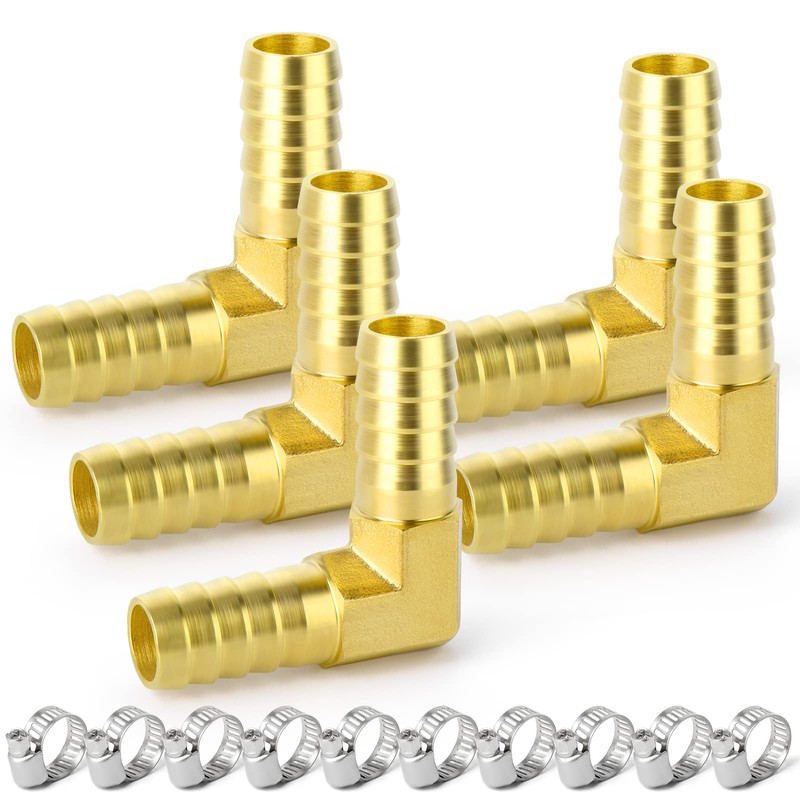 ERGAOBOY Pack of 5 14 mm Brass 90 Degree Angle Hose Nozzle, 2 Way L Shaped Angle Hose Connector with 10 Pieces Clamps