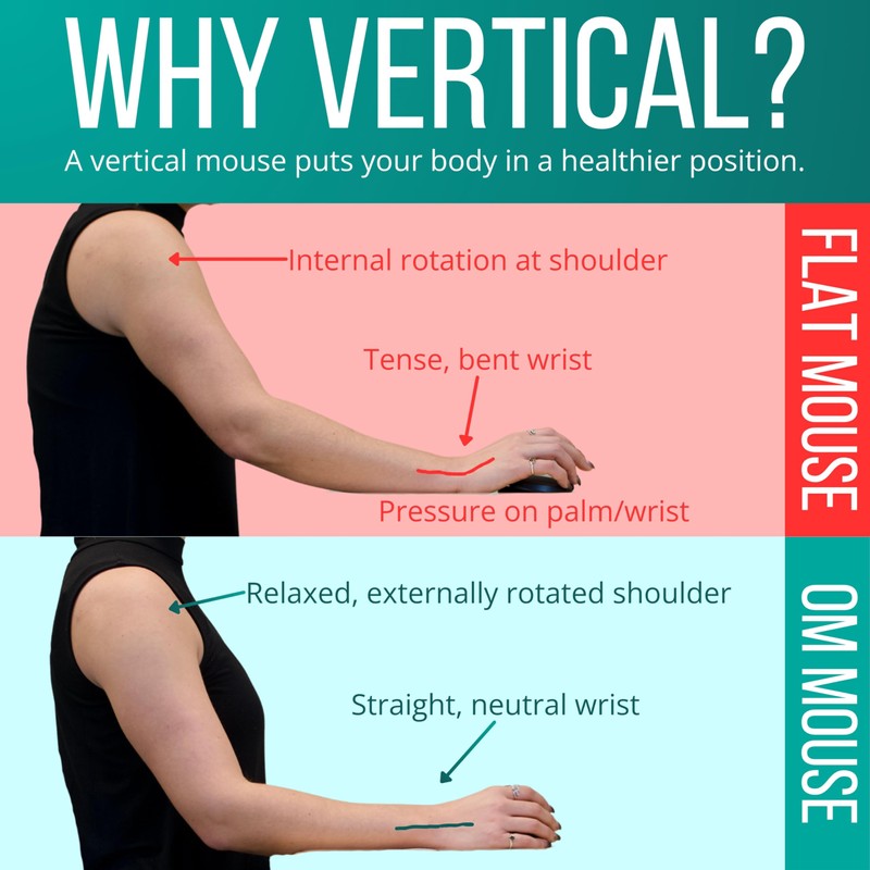 • PERFECT ERGONOMICS. You hold your mouse for hours every day, so it's critical to use a good one! A vertical mouse is a must, and Om has the most ergonomic shape on the market, plus silent, micro-force buttons to further reduce tension and fatigue.
