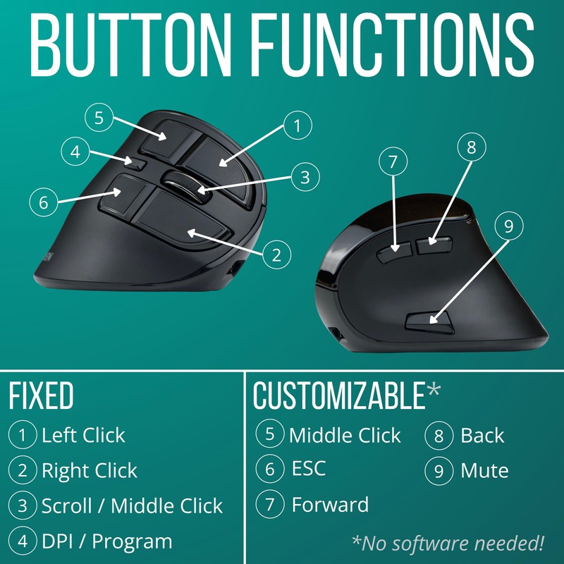 • MAXIMIZE PRODUCTIVITY with 5 easily customizable buttons and an onboard screen. In less than 10 seconds (and without downloading software), you can assign custom functions to your vertical mouse like one-click copy or paste.