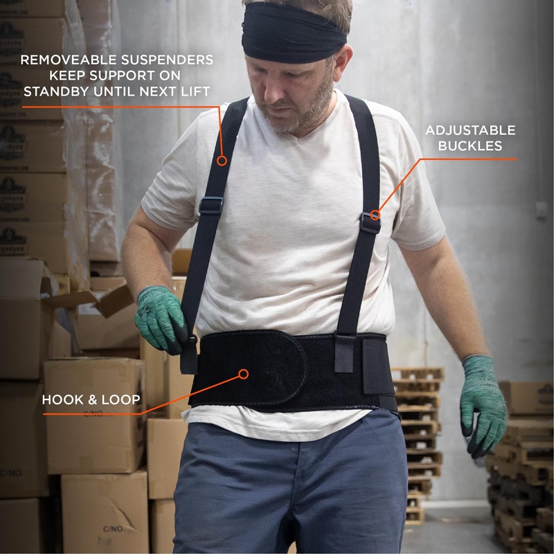 - SUSPENDERS - Adjustable, detachable suspenders keep belt in place and on standby before next lift