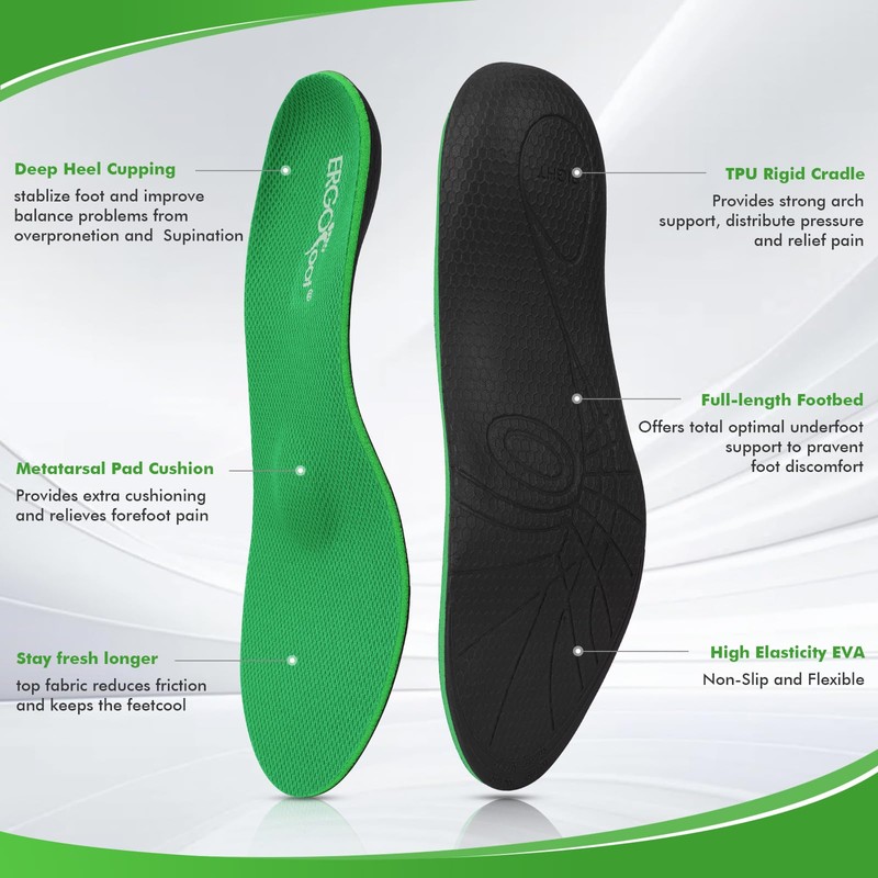 - 【Orthotic Arch Support】ERGOfoot arch support insoles can improve the fit of your running shoes, make sure your arches are supported where they need it and provide a convenient and extremely soothing solution for you.