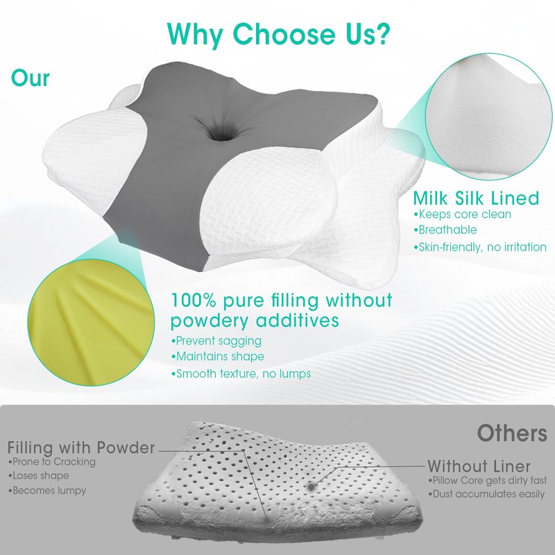 Experience Ergonomic Comfort with Our Butterfly Contour Memory Foam Pillow Crafted as a premium cervical pillow for side sleepers, back sleepers, and even stomach sleepers, our butterfly pillow – a top-rated ergonomic neck pillow – cradles your head and neck with precision, offering exceptional neck support to promote natural spinal alignment. This design eases pressure on your neck and shoulder muscles, encouraging proper sleeping posture that may help reduce snoring and morning discomfort. The adaptive memory foam of this contour pillow molds to your unique shape while maintaining the perfect supportive firmness, making it an ideal neck and shoulder pillow for uninterrupted rest. Whether you’re a side sleeper needing targeted shoulder relief or a back sleeper seeking spinal harmony, this butterfly pillow for neck pain relief helps you wake up refreshed, free from stiffness, and ready to tackle the day.