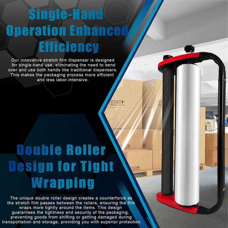 - Double Roller Design for Tight Wrapping: The unique double roller design creates a counterforce as the stretch film passes between the rollers, ensuring the film wraps more tightly around the items. This design guarantees the tightness and security of the packaging, preventing goods from shifting or getting damaged during transportation and storage, providing you with superior protection.