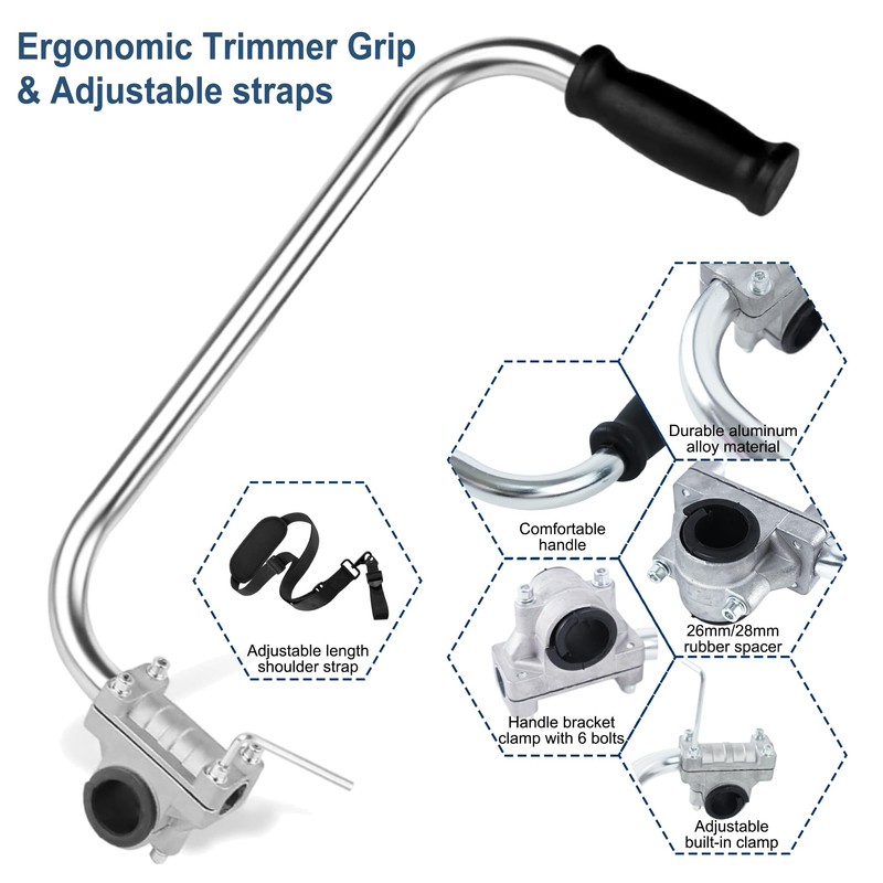 • 【Easy to Install and Durable】Ergonomic Trimmer Handle Kit is easy to assemble, and the included hex wrench can be used to adjust the angle or height of the lawn trimmer handle grip. Back saver trimmer grip is built with high quality aluminum for strength without added weight, plus a rust-resistant coating for all-weather durability. The string trimmer head and tune up kit are made of nylon and PE, for superior abrasion resistance and rust and corrosion resistance for longer life.