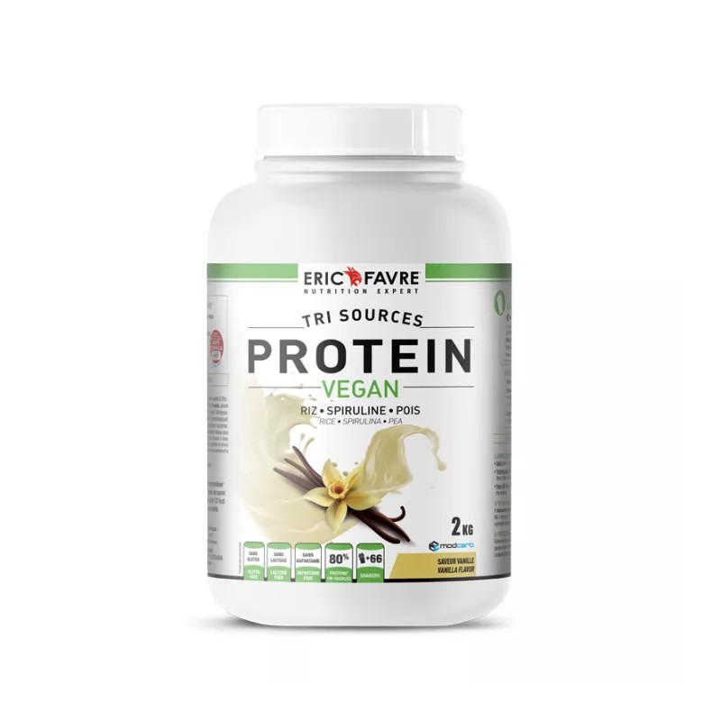 Eric Favre Protéine Vegan Tri-Sources is available in jar form. In addition, this product is available in a variety of flavors: Vanilla 500 gr, Chocolate Hazelnut 500 gr, Pistachio 500 gr, Vanilla 1.5 kg, Chocolate Hazelnut 1.5 kg and Pistachio 1.5 kg.