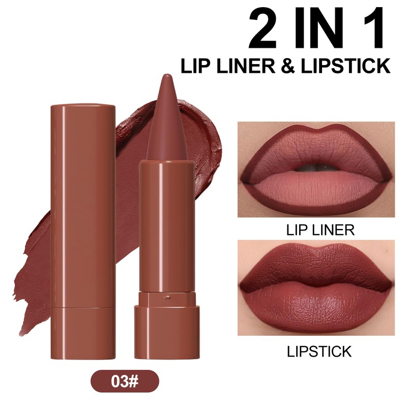 Erinde 2-in-1 Lip Liner and Lipstick Lip Combo Set, Matte Nude Dark Brown Red Lip Liners Creamy Lip Pencil, High Pigmented Long Lasting Waterproof Smudge Proof Lip Liner Lipstick Crayon Makeup, 03#