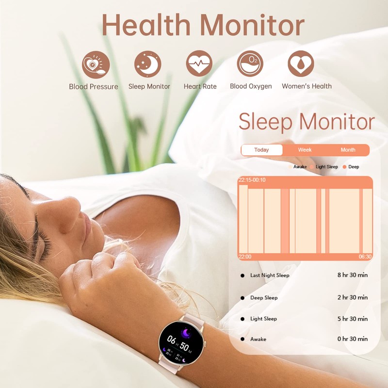 • Health partner: The women's smart watch is equipped with a high-performance sensor to monitor your heart rate, blood oxygen and blood pressure. Wear the watch to sleep, automatically track your sleep and analyze your sleep quality. The watch also has reminders of sedentary lifestyle, drinks and menstrual cycle. The watch pays attention to your health at all times, records physical changes and helps you make appropriate adjustments