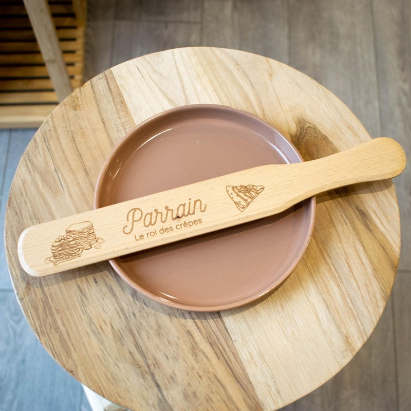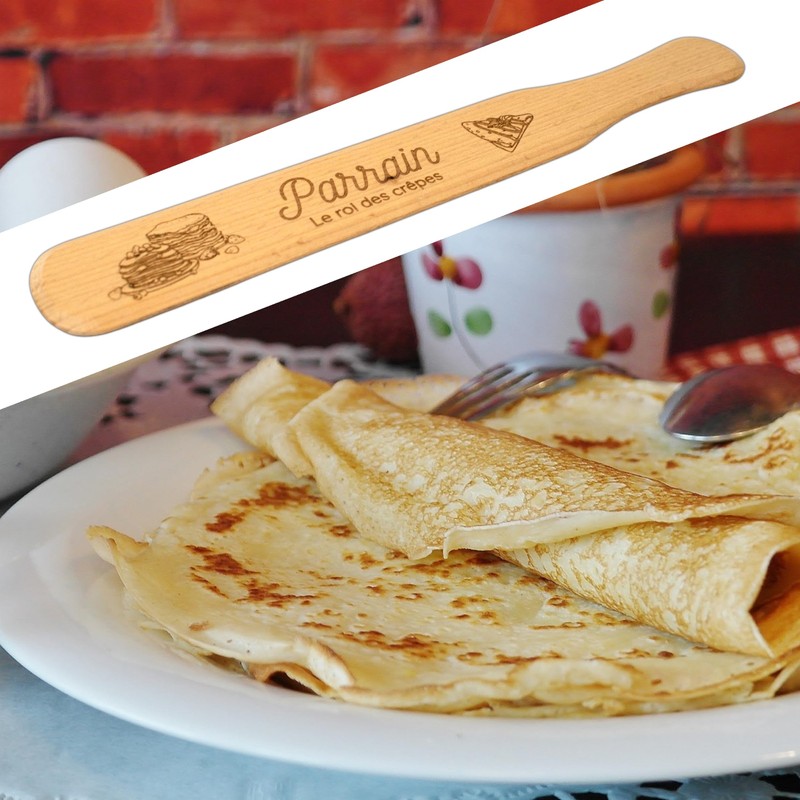 - Craftsmanship and quality in the kitchen. Made of natural wood, this crepe spatula is designed for easy handling and perfect display of crepe dough. In addition to its quality craftsmanship, it has a personalized design to celebrate your godfather. It is the perfect godfather gift to combine emotion and utility. An original and durable gift idea for successful pancakes!