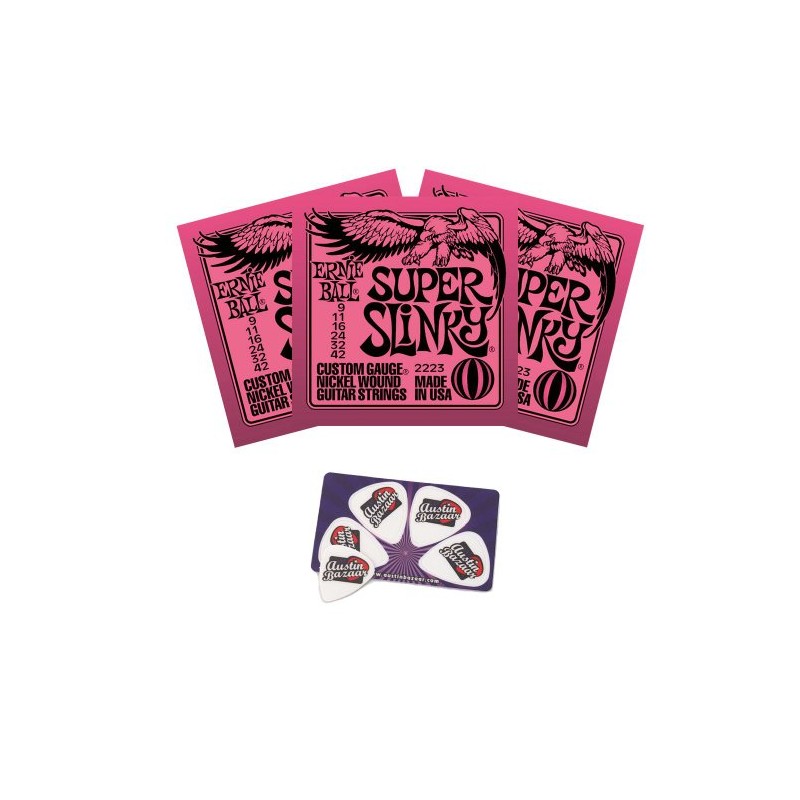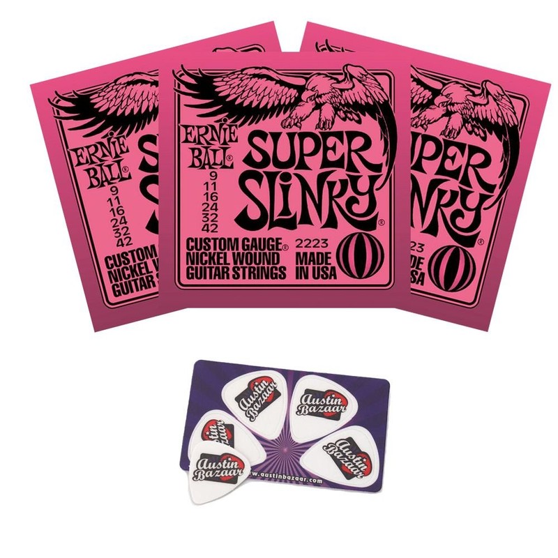 Ernie Ball 2223 Super Slinky String Set (9-42) Electric Guitar Strings - 3 Pack with Picks