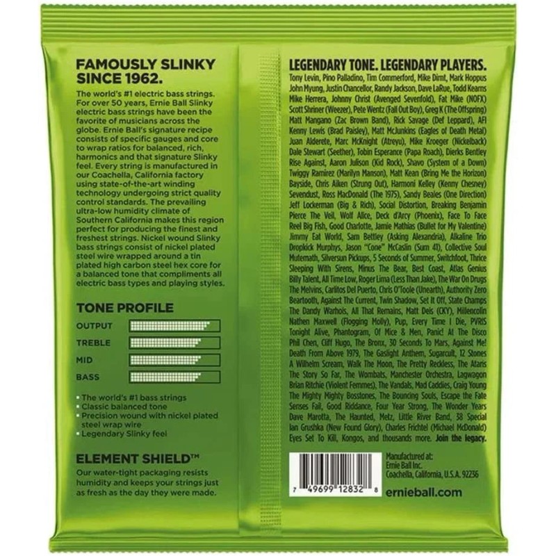Ernie Ball Regular Slinky Nickel Wound Bass Guitar Strings, 50-105 Gauge (P02832)Ernie Ball Bass Slinkys are played by legendary bands around the world including Tool, Rage Against the Machine, Zac Brown Band, Green Day, and Avenged SevenfoldRegular Slinky’s 50-to-105 gauge is one of the most popular 4-string bass gaugesRich, balanced toneElement Shield Packaging prolongs string life and keeps strings as fresh as the day they were madeMade in California, USA with the freshest and finest materialsSlinky Bass StringsErnie Ball Slinky Roundwound bass strings are made from nickel-plated steel wrapped around a hex shaped steel core wire. Played by beginners and rockstars alike, Slinky bass strings provide a classic balanced tone and are offered in many gauges. Bass Slinkys are available in six different gauges for 4-string bass and three different gauges for 5-string bass. We also offer Slinky bass strings for 6-string bass.