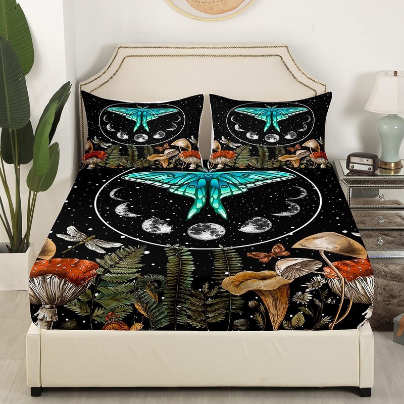 Erosebridal Blue Butterfly Sheet Set Queen,Dragonfly Moth Mushroom Bed Sheets Moon Phase Flat Sheet Starry Sky Fitted Sheet,Hippie Wild Fungus Sheets Boho Bohemian Style Home Room Decor Luxury,Black
