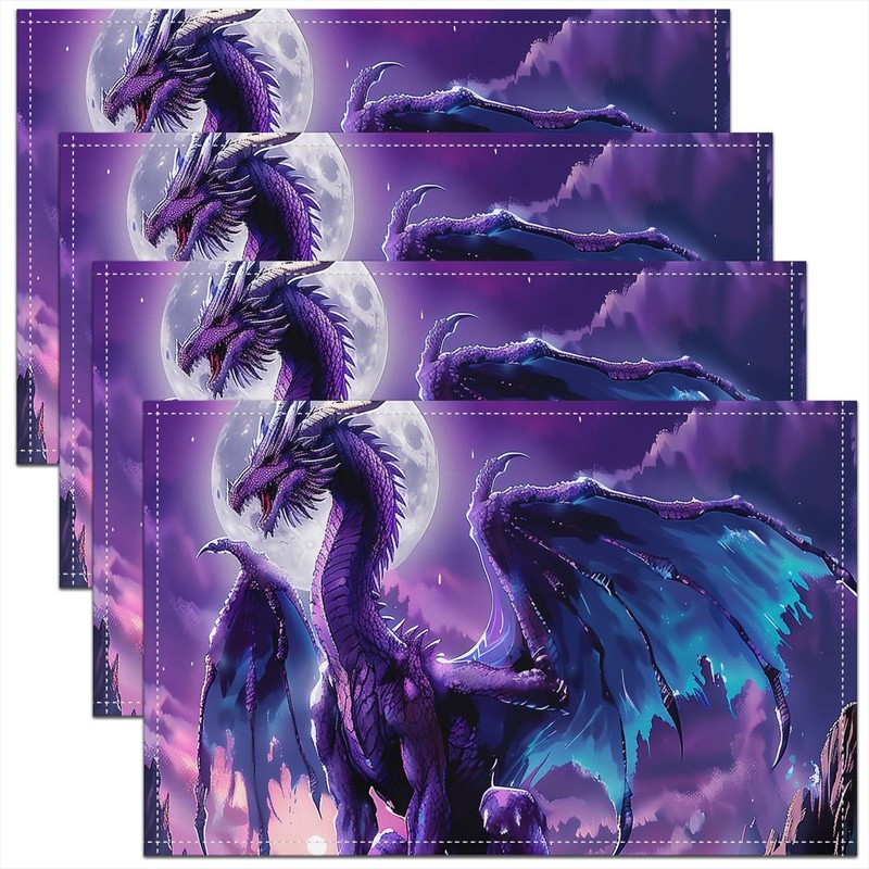 Erosebridal Dragon Placemats 12x18 Inch, Fantasy Dragon Pterosaur Place Mats, Western Animals Hills Moon Heat Resisting Table Mats, Blue Purple Black Waterproof Placemats