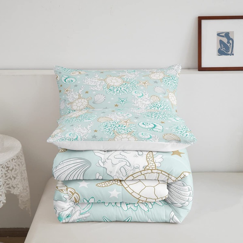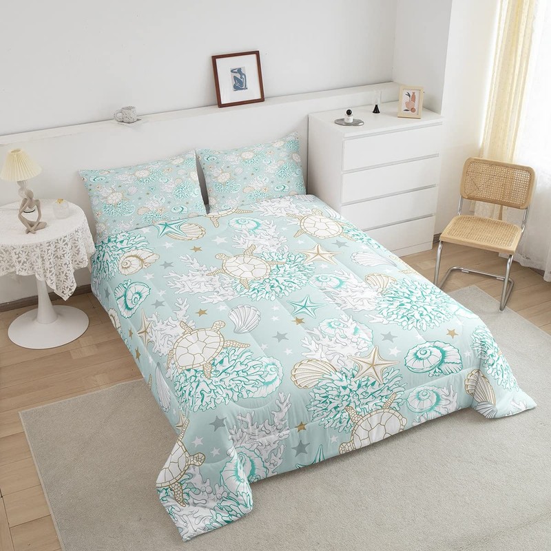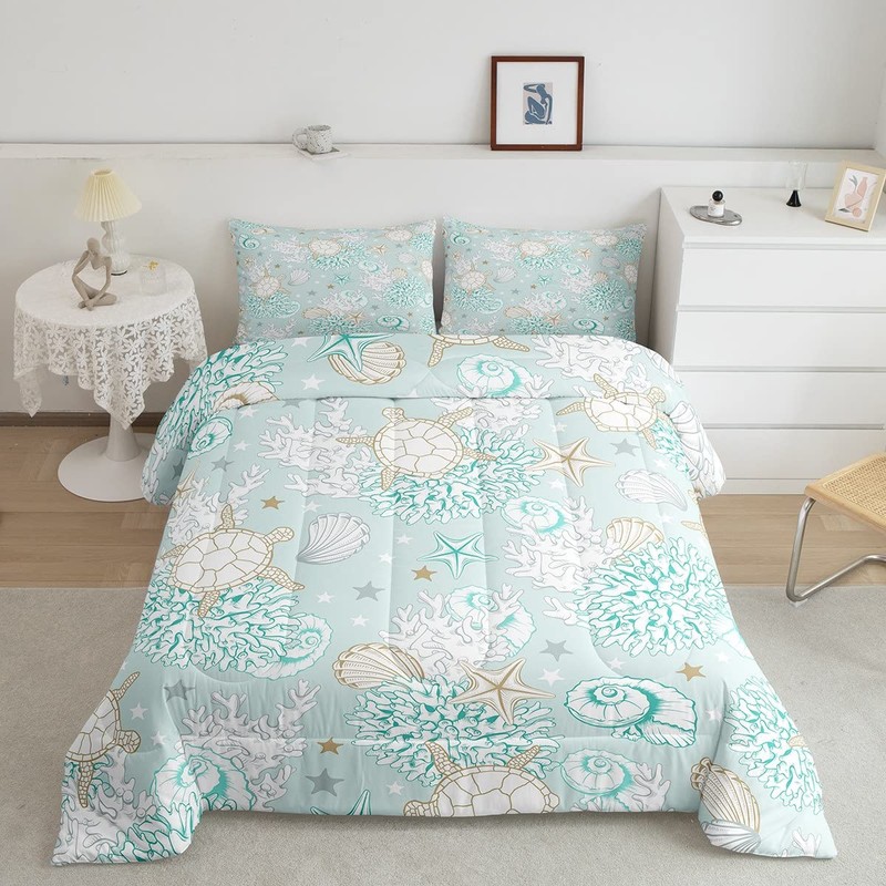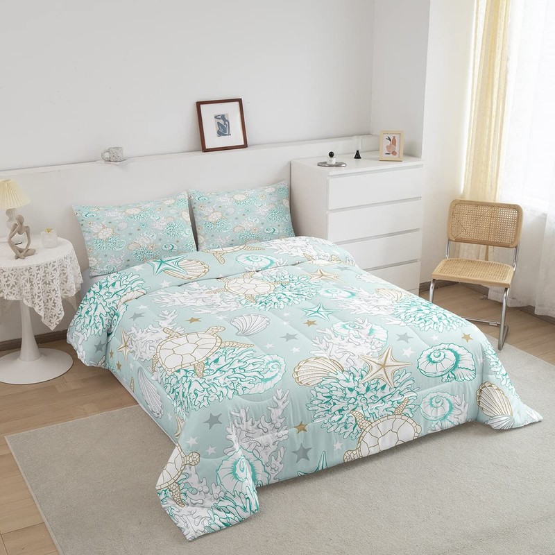 Erosebridal Ocean Quilt Set Full Kids Sea Turtle Bedding Comforter Sets Coastal Coral Conch Starfish Shell Bedding Comforters for Boys Girls,Marine Animal Duvet Insert Teal Khaki with 2 Pillow Cases