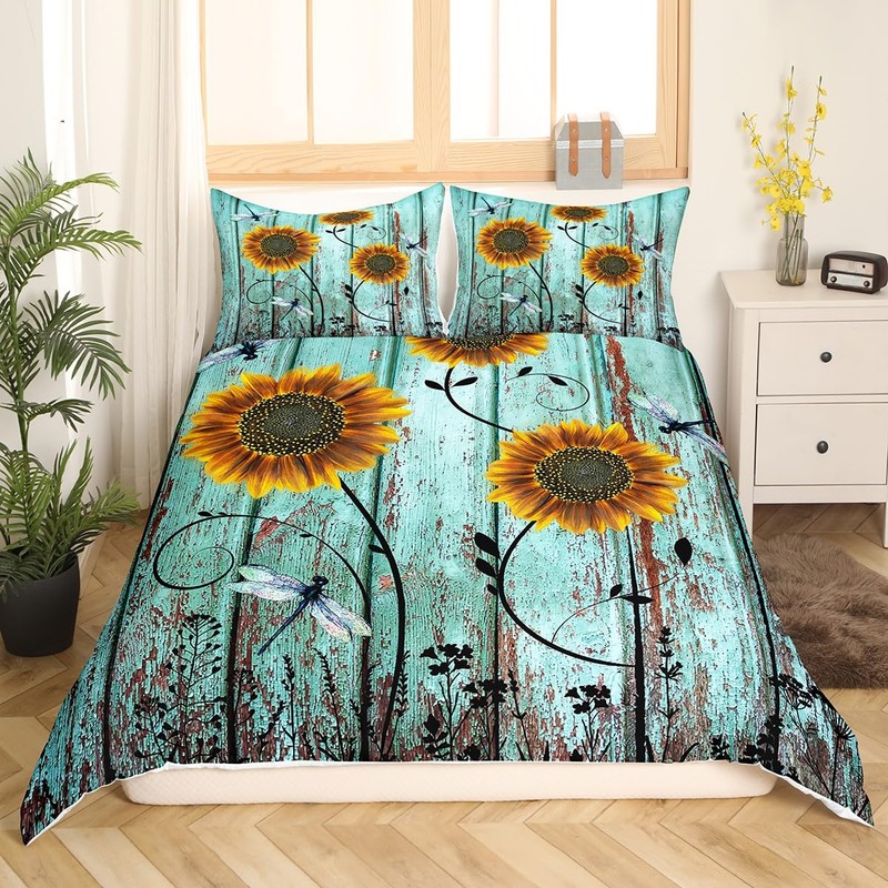Erosebridal Turquoise Country Farmhouse Bedding Set Rustic Sunflower Duvet Cover Twin Retro Grunge Old Wooden Board Comforter Cover for Girls Adults Women Dragonfly Botanical Bed Set 1 Pillow Case