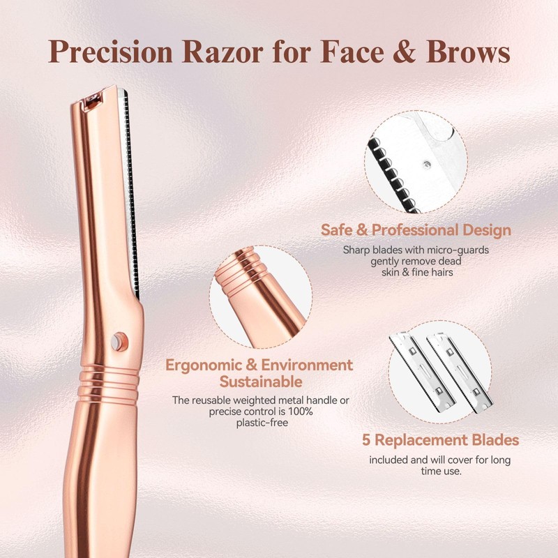 - Metal Eyebrow Shaver – Ergonomically designed with replaceable blades for a cost-effective, alternative that reduces plastic waste