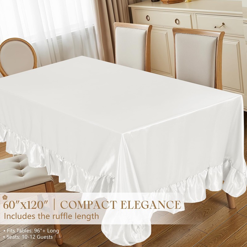 Ersmak White Satin Ruffle Edge Tablecloth - 60 x 120 Inch Rectangle Satin Table Cover Bright Silk Table Cloth for Weddings, Banquets, or Home Dining