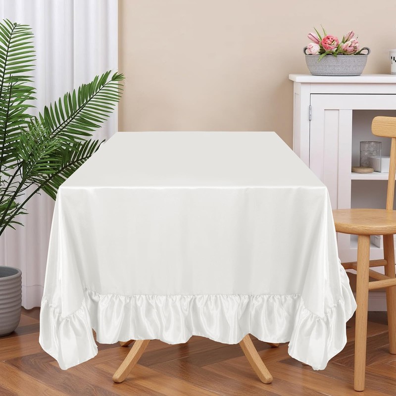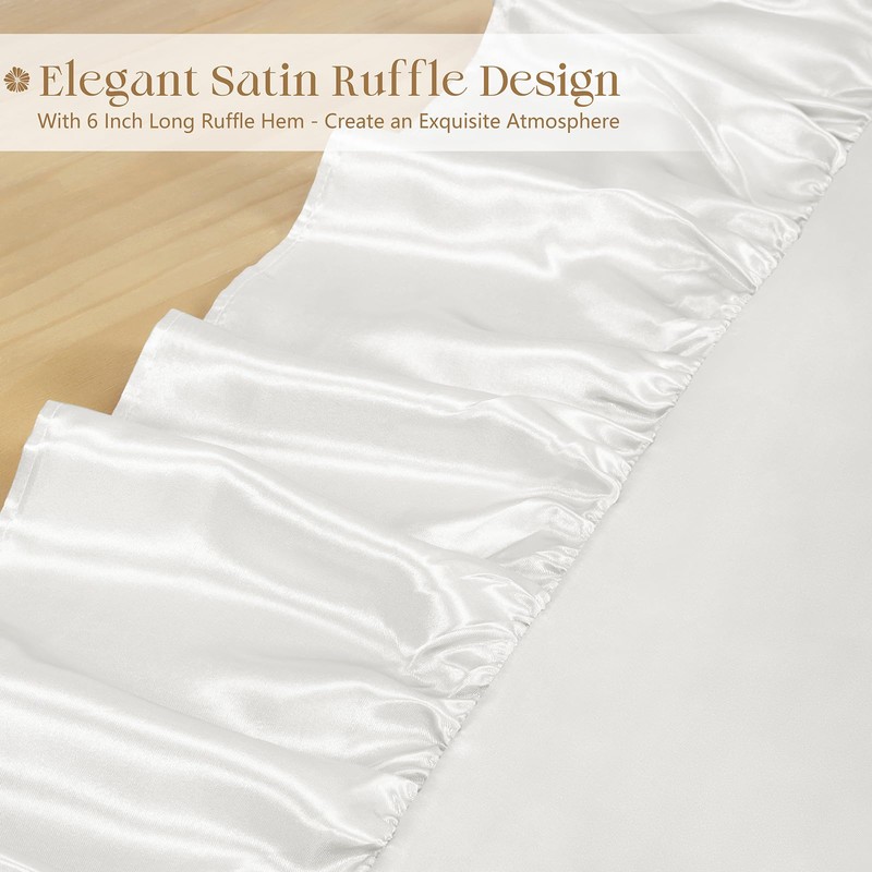 • ELEGANT SATIN RUFFLE DESIGN: Crafted with luxurious satin fabric and delicate ruffled trim, this tablecloth exudes vintage charm and modern elegance. The smooth, glossy finish and graceful draping create a sophisticated atmosphere, perfect for weddings, banquets, or upscale home décor.