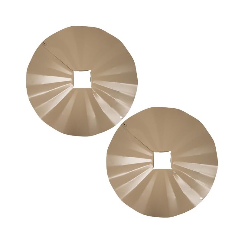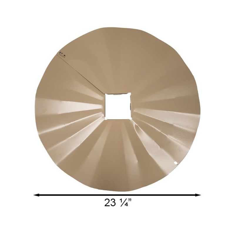 Generous, 23.25” diameter baffles each create an extensive guard around an existing 4 x 4 post. Each galvanized steel body creates a hardy, chew-proof unit that deters predation. Wrap-around design allows easy installation without having to remove your feeders or bird houses. Tan tone and baked on, corrosion-resistant finish creates a pair of naturally alluring items in your yard. Each opening’s square center surrounds a 4 x 4 post (not included) for simple compatibility, and four downward tabs below help secure the pieces together with included screws. Locking tab helps each baffle retain its circular shape once it’s been installed. Slightly wavy finish lends decorative appeal to these alluring baffles. Made in the USA.