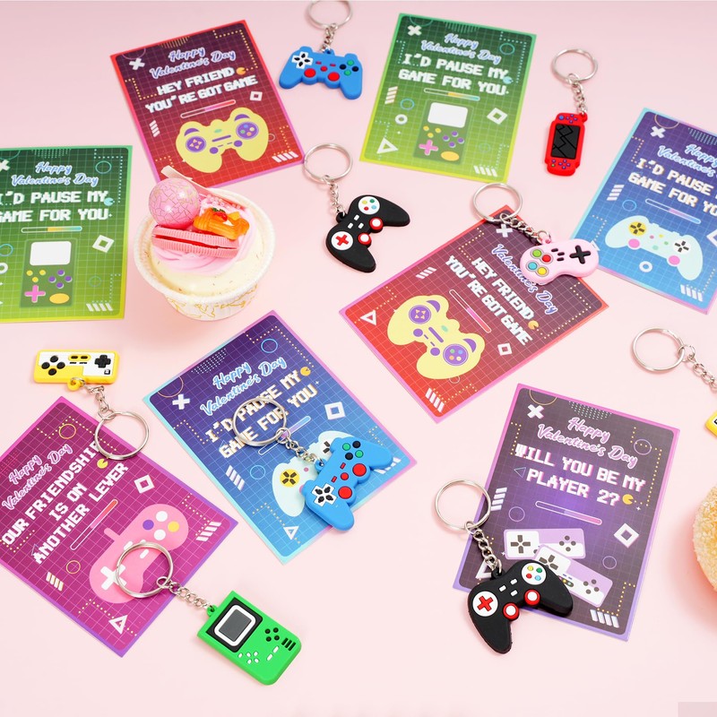 - PACKAGE INCLUDE - Valentines Party Favors set includes 30 PCS video game themed keychains (6 designs) and 30 PCS video game gift cards (6 designs). Children will love these fashionable game keychains. These gifts are perfect for class exchanges and ideal for Valentine's Day sharing!