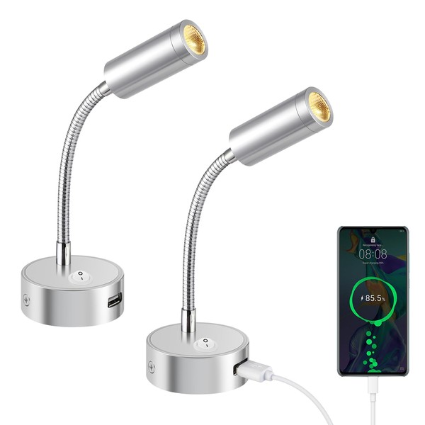ERWEY Set of 2 LED Reading Lamps, 12 V, Motorhome with Flexible Gooseneck and USB Charging Port, 3000 K, Warm White, DC 12 V-24 V Spot for Boat, Caravan, Interior Lighting, Yacht, Hardwired Wall