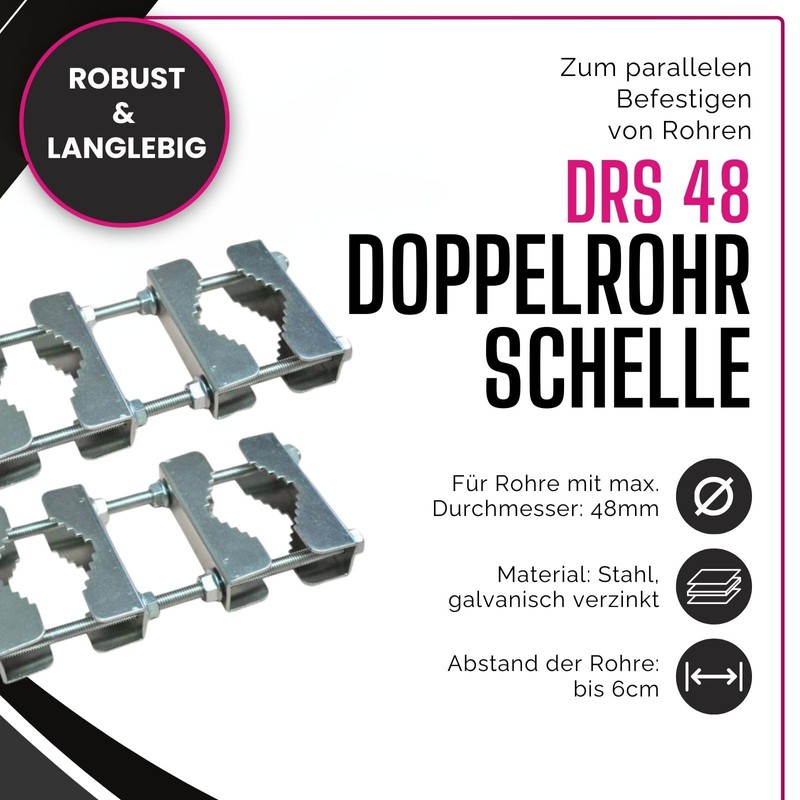 - Reliable fixation – these double pipe clamps offer the perfect solution for attaching two pipes in parallel.
