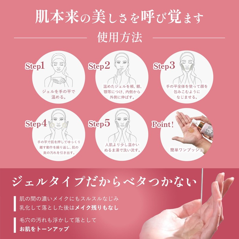 The cleansing gel lifts up oil based stains such as makeup and sebum, and emulsifies with water or warm water to remove hydrophilic stains such as dust and sweat.