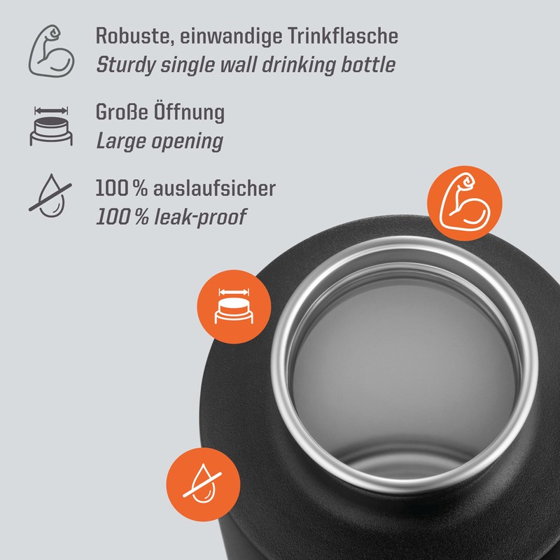 • The all-rounder: this robust, single-walled bottle made of high-quality 18/8 stainless steel is ideal for the city and the outdoor area. Free from BPA and phthalates, our water bottle is the perfect companion in any situation.