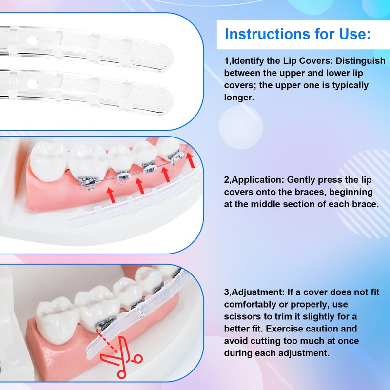 • Orthodontic Lip Cushion: Designed to provide a soft, protective layer between your lips and the sharp edges of braces, this lip cushion significantly reduces irritation and discomfort. Its flexible, clear material conforms to the shape of your teeth and braces, ensuring a snug and comfortable fit.
