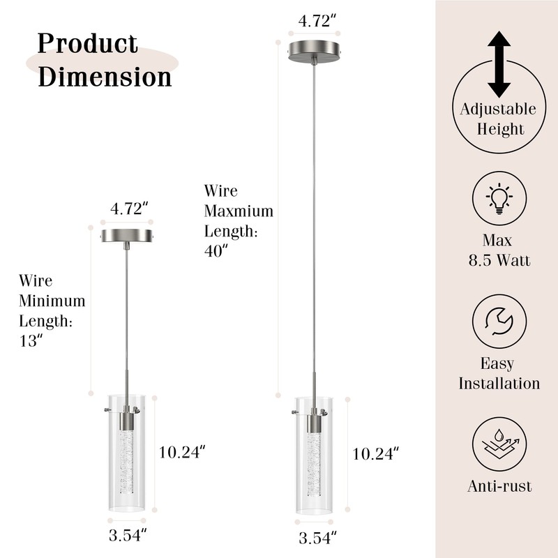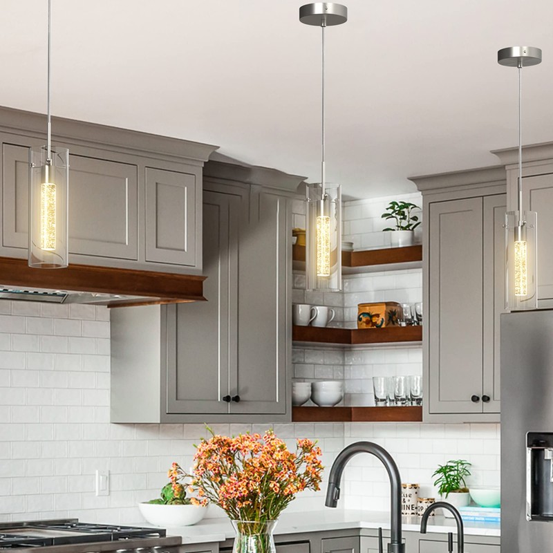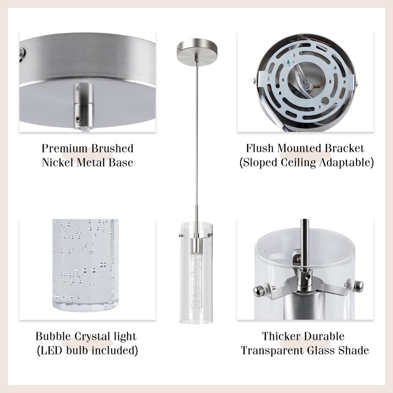 - √ Modern Design: Simple design line, graceful taste, Esfos pendant light is eye-catching and can suit almost all kinds of home styles. Brushed nickel finish, clear glass shade and mimicking champagne bubbles frozen in ice, this crystal pendant can create a modern charm glow to illuminate your house.