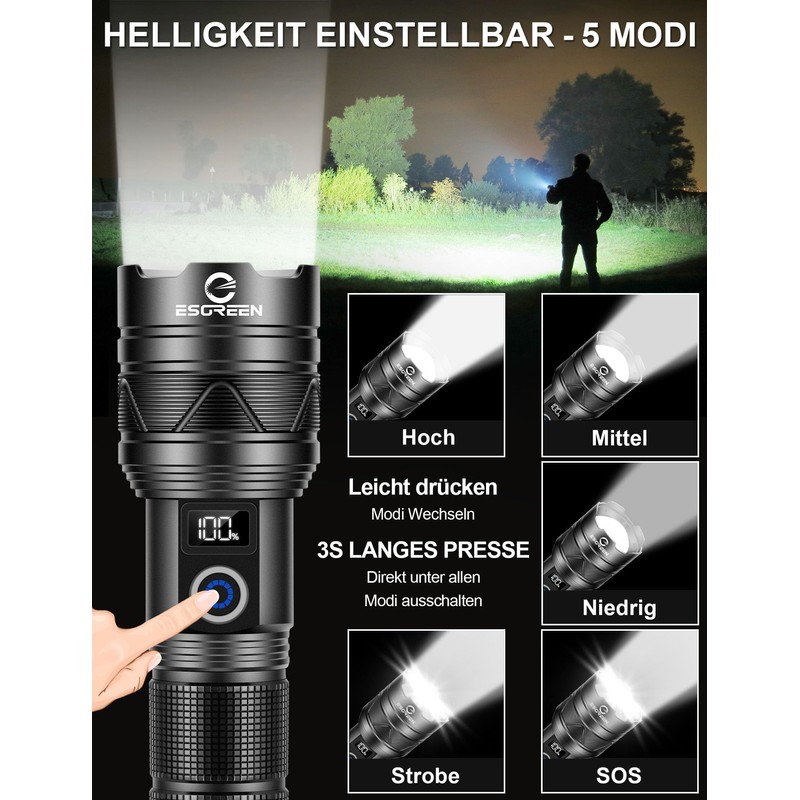 - [ Verbessert Extrem Hell & Lange Reichweite LED ] Die ESGREEN ED0330 LED Taschenlampen aufladbar bestehen aus einer verbesserten PH-L330 30W LED, die eine Eigenschaft von hoher Helligkeit und ultra langem Strahl hat. Es bietet eine maximale Leistung von 500000 Lumen, es kann leicht den ganzen Raum und Garten beleuchten. Der ultrastarke Strahl bietet einen hochkonzentrierten Kreisstrahl, sodass er leicht und klar auf Objekte bis zu 3280 Fuß entfernt fokussieren kann. Es ist ideal für Camping, Wandern, Hundespaziergang, Reiten oder Outdoor-Abenteuer und Notfälle.
