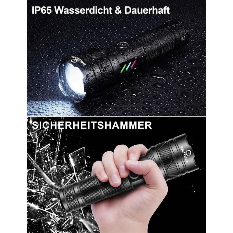 - [ Schlagfestigkeit & IPX5 Wasserdicht ] Der Taschenlampenkörper besteht aus super harter Luftfahrtaluminiumlegierung, schlagfest, verschleißfest und fallfest. Es ist stark genug, um einen 10-Fuß Unfallfall zu überstehen und sogar von einem LKW überfahren, es funktioniert immer noch! IPX65 wasserdichte Taschenlampe hat einen eingebauten wasserdichten Gummiring mit hoher Festigkeit, so dass es kein Problem gibt, bei schlechtem Wetter, wie Regen oder Schnee verwendet zu werden.