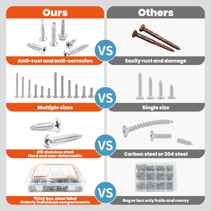- PREMIUM 410 STAINLESS STEEL: We chose the quality 410 stainless steel as opposed to traditional carbon steel. This is a new magnetically attracted stainless steel, also called stainless iron.It offers higher density, better stability and durability. Rust and corrosion resistant. It is not easily stripped by a screw gun. Due to these better performances, self drilling screws assorted set will be able to be used for a longer period of time.