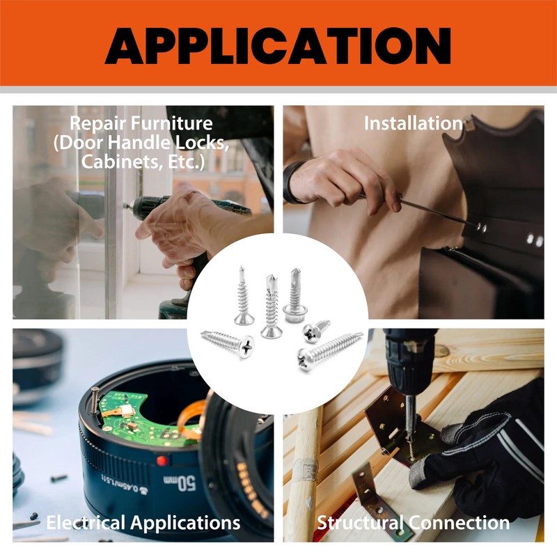 - WIDE APPLICATION: These self-drilling screws can be perfectly used for home furniture fastening, stores, office areas, and mechanical industries, among others. It helps in connection fixing such as repairing or fixing wooden furniture in your home, door handle repair, connecting sheet metal structures, and performing basic mechanical maintenance such as electronics and electrical equipment.You can use them with confidence.