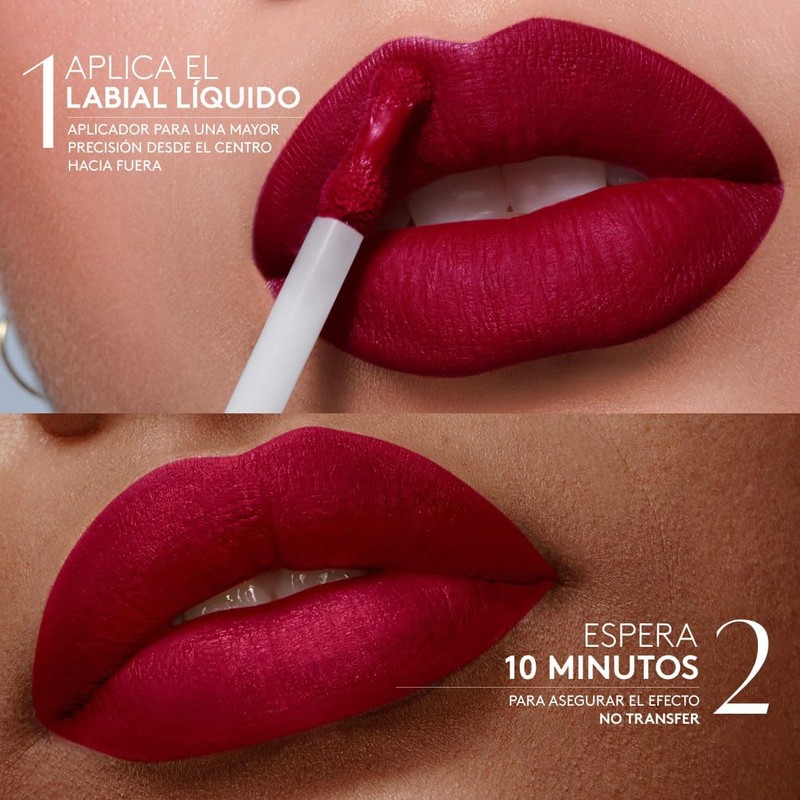 • Labial Mate no transfer** y full hidratación con ácido hialurónico por 24H.