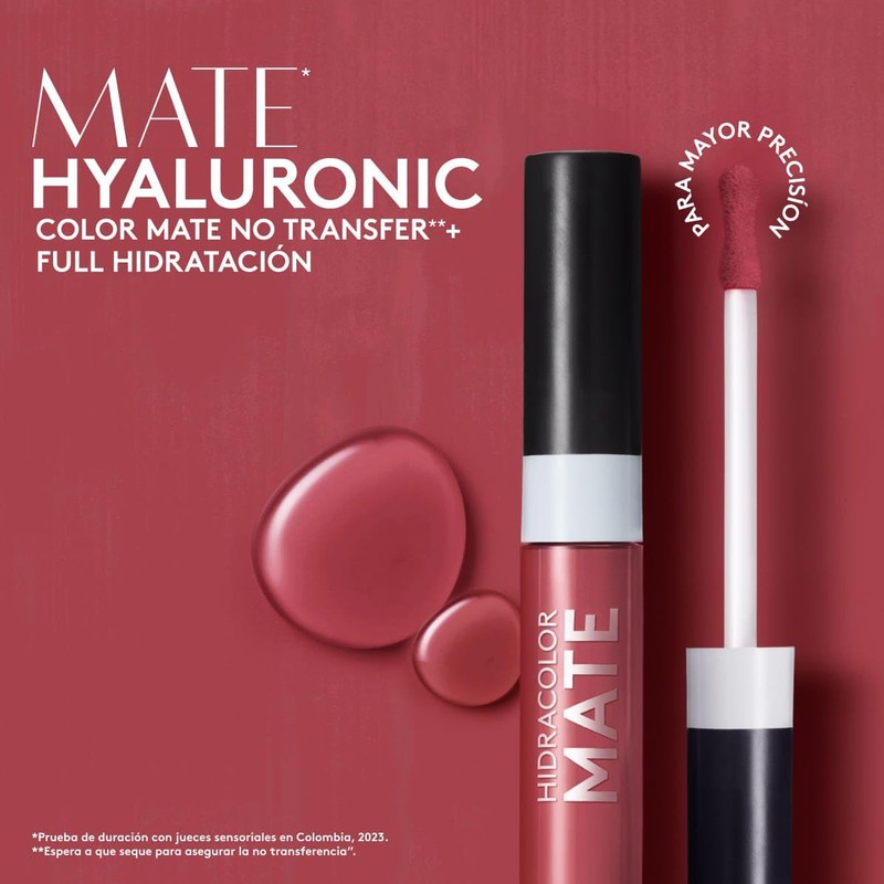 • Labial Hidracolor Mate Líquido de larga duración con ácido hialurónico. MATEHYALURONIC X 24H* no transfer** y full hidratación. ¡Todos los mates para todas las mujeres! Acabado: Mate. Capacidad: 6 ml.