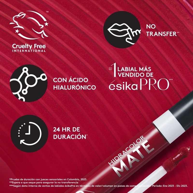 • *Prueba de duración con jueces sensoriales en Colombia, 2023. **Espera a que seque para asegurar la no transferencia. ***Según data interna de ventas de labiales ésikaPro en términos de valor/volumen en países de comercialización. Periodo: Ene 2023 - Dic 2023.