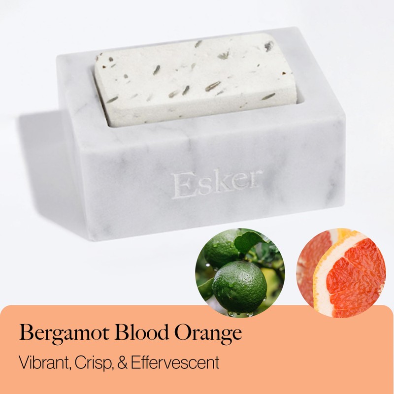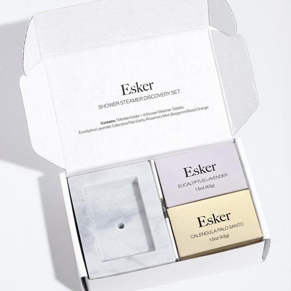 ESKER - Aromatic Shower Steamer Set | Vegan, Cruelty-Free, Clean Beauty (Calendula Palo Santo + Eucalyptus Lavender + Rosemary Mint + Bergamot Blood Orange Steamers with Marble Holder)