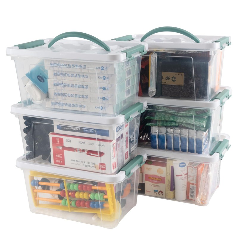 Eslite 6 Quart Plastic Stackable Storage Latch Bins,Clear Latching Box with Handle and Lid,Pack of 6 (Green Handle)