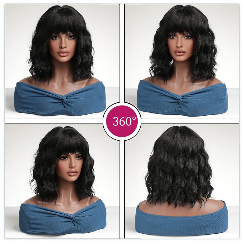 Esmee Bangs, Short Black Bob Wigs for Women, Wavy Bob Wig with Bangs Synthetic Natural Looking Heat Resistant Fiber Wigs Daily Party Cosplay Use-13 Inches