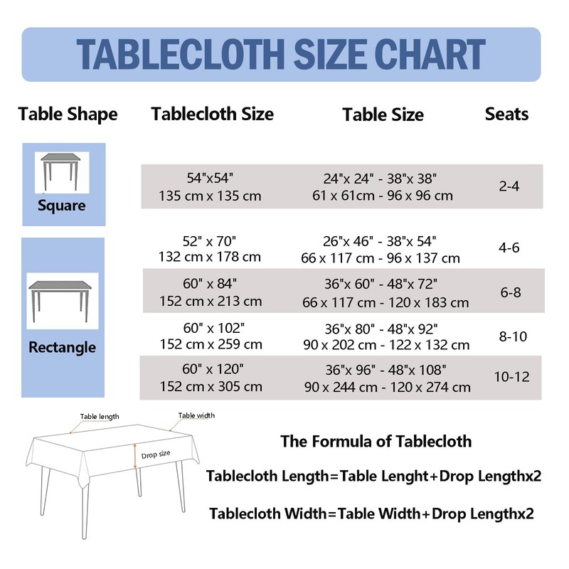 • Rectangle/Oblong, 60" x 102" (8-10 Seats) - The table cloth measures 60" Width x 102" Length and fits table for 8-10 seats. The suitable table size between 36"x80"-48"x92".