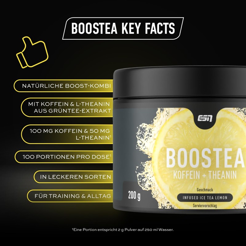 • BOOST-KOMBI: In unserem Boostea vereinen wir Koffein und Grüntee-Extrakt, der für einen Anti-Müdigkeitseffekt sorgt