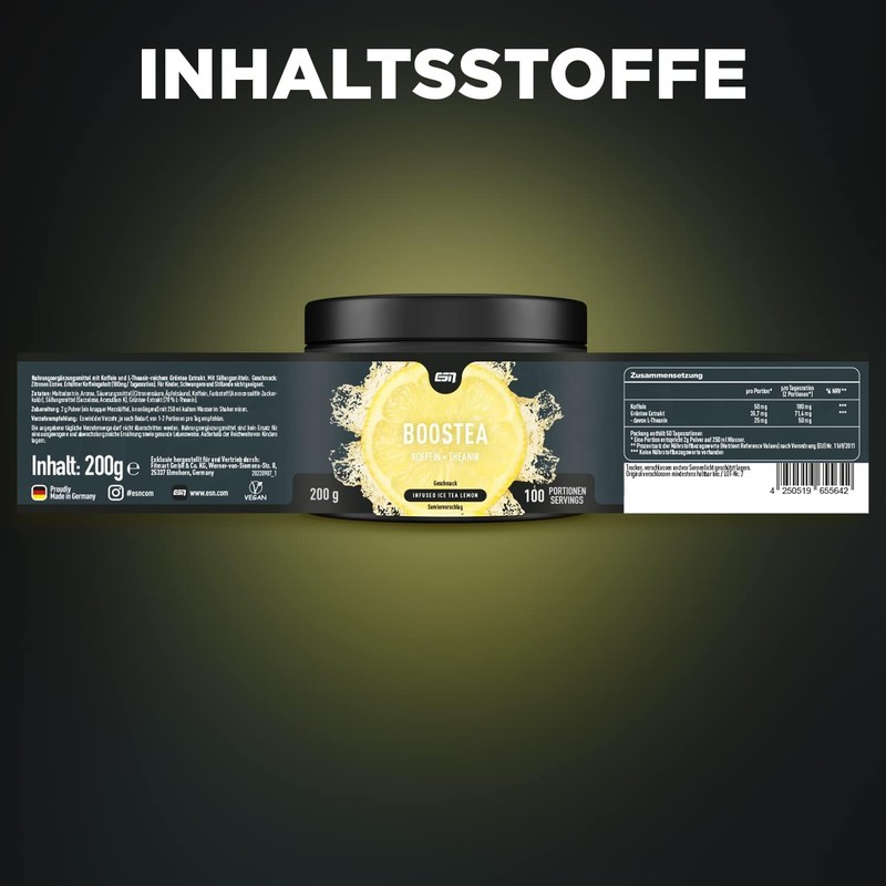 ESN Boostea + Gratis Shaker, Infused Ice Tea Lemon, 2 x 200 g, Booster mit Koffein, L-Theanin und Grüntee-Extrakt, vegan, geprüfte Qualität - made in Germany