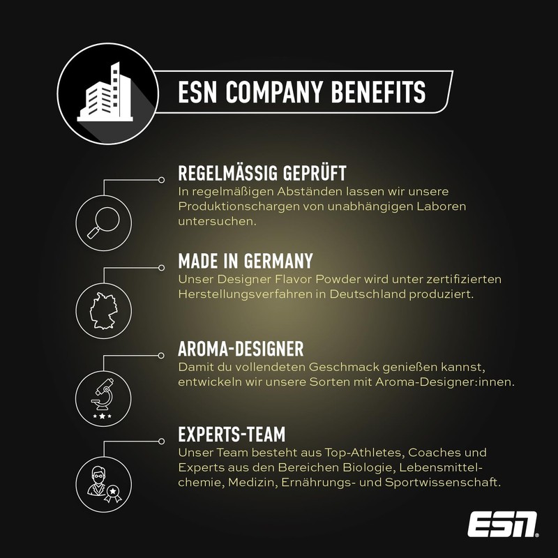 - Made in Germany: ESN Flav’n Tasty is manufactured in Germany to strict quality standards.