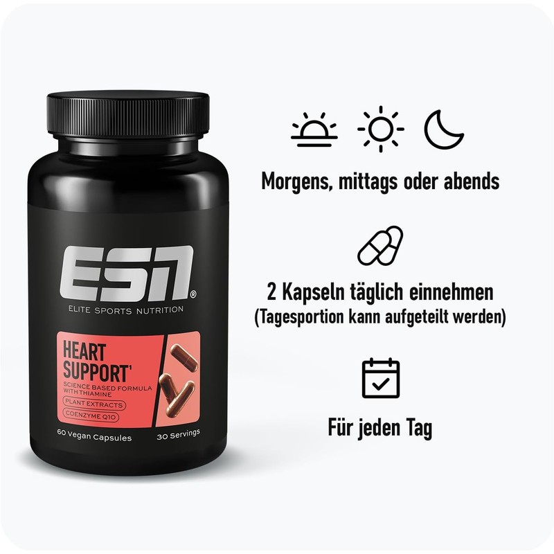 • Stock: one can of our ESN Heart Support contains 60 vegan capsules free from unnecessary additives. With a recommended dose of 2 capsules daily with a meal, one can offers you 30 days supply