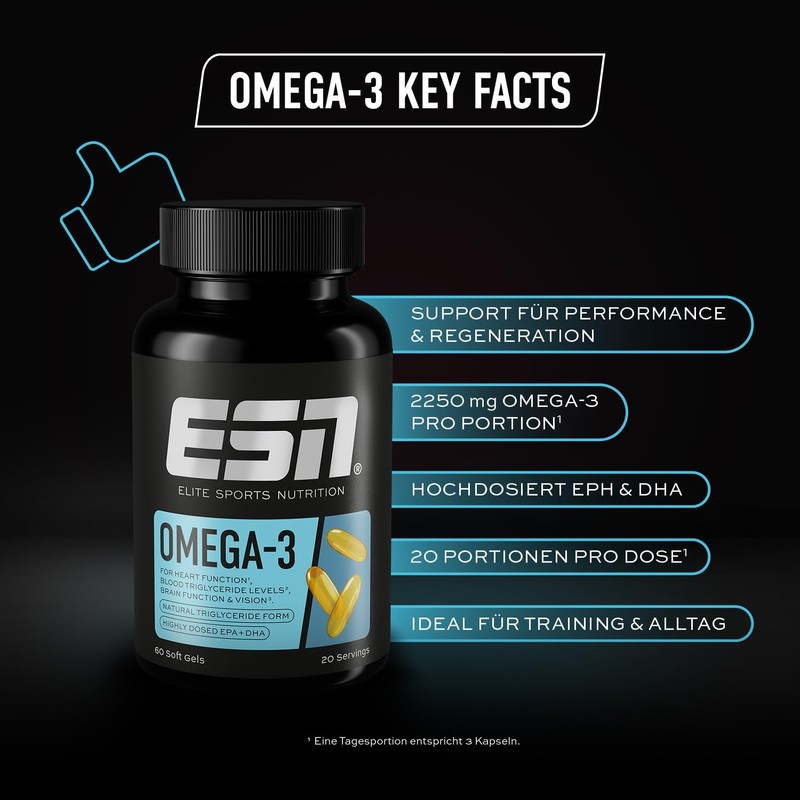ESN Omega-3, 60 capsules, high-dose EPA & DHA, supports heart, brain & more, 1200 mg EPA & 900 mg DHA per serving, regularly tested - made in Germany