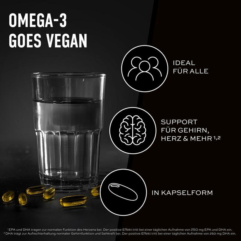 - Top dosage: with unique 720 mg algae oil per capsule. This contains an unprecedented active ingredient structure with over 200 mg DHA and over 100 mg EPA. So not only allergy sufferers but also vegans benefit with an enormously high-dose Omega 3 oil supply. The daily need for DHA/EPA building blocks does not have to be difficult