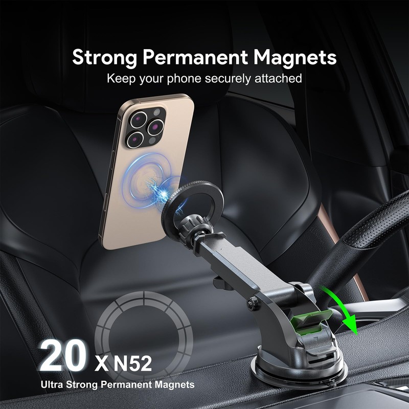 • Strong Suction Base: The suction cup provides firm adhesion to the windshield or dashboard for added stability.