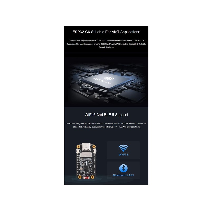 - ESP32-C6 Suitable For AIoT Applications,Powered By A High-Performance 32-Bit RISC-V Processor And A Low-Power 32-Bit RISC-V Processor, The Main Frequency Is Up To 160 MHz, Powerful AI Computing Capability & Reliable Security Features