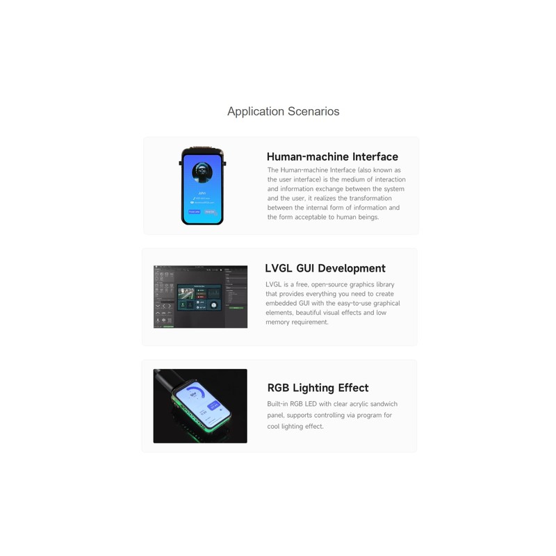 screen can smoothly run GUI programs such as LVGL. Combined with various peripheral interfaces, suitable for the quick development of the HMI and other ESP32-C6 applications.