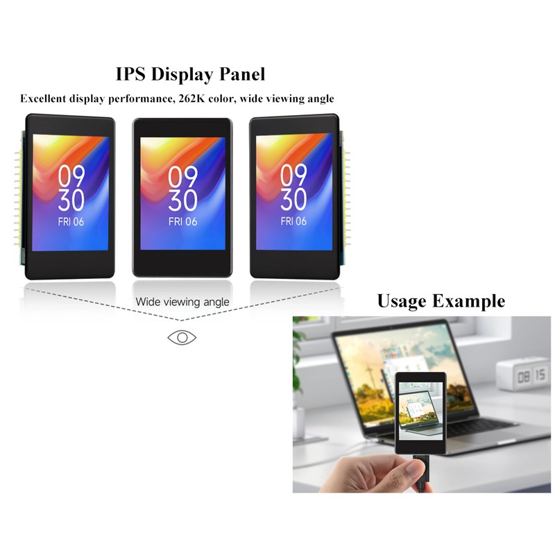 Built-in ST7789T3 display driver and CST816D capacitive touch chip, using SPI and I2C communication respectively, effectively saving the IO resources.